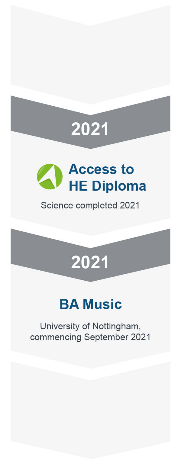 I received an offer from the University of Nottingham in December 2020. Having completed the Diploma, I have met all the requirements and so will be going to Nottingham in September 2021 to study music. I am wanting to focus on writing and composing as well as music theory while I am at university, and I would like to work in the future in writing music for TV and film. My experience of being self-employed over the last 10 years has made me aware of how important versatility is within this career. Spending a year studying science has given me a new insight into how it interfaces with music and has prepared me well for my future studies at university.